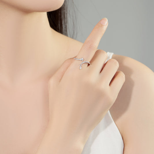Confeccionado em Prata S925, o anel garante durabilidade e brilho intenso. O destaque fica por conta do seu design aberto e ajustável, onde o aro é adornado com uma zircônia solitária brilhante. O centro da peça é marcado por uma delicada corrente pendente que carrega dois pingentes estelares: