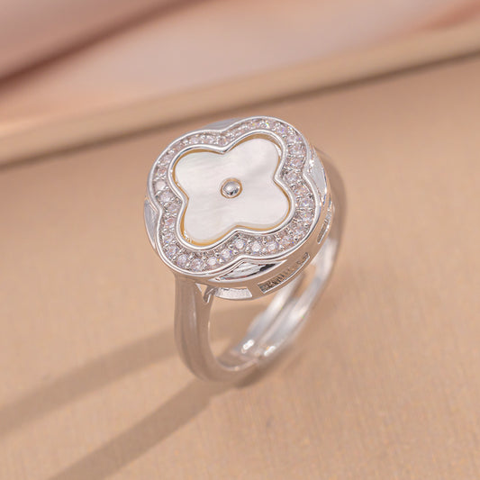 Detalhes: Anel ajustável com design de trevo, madrepérola e zircônias cravejadas.