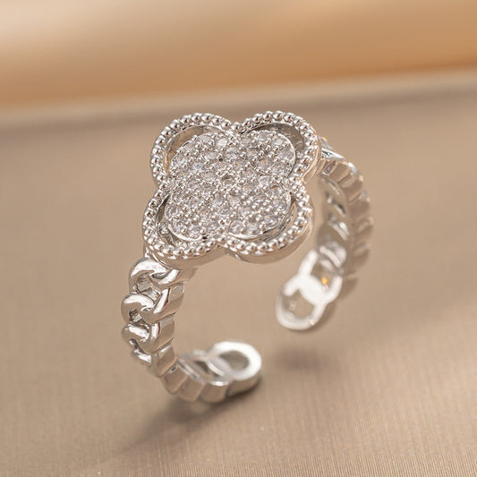 Detalhes: Anel ajustável com design de trevo e zircônias cravejadas.