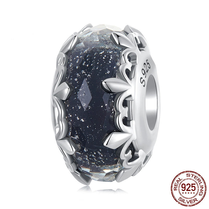 O nosso Berloque Separador Galáxia Mística é uma verdadeira joia celestial. Feito em Prata 925 autêntica, este berloque tem um vidro facetado azul com pequenas partículas brilhantes que parecem estrelas, lembrando a beleza de um céu estrelado.
