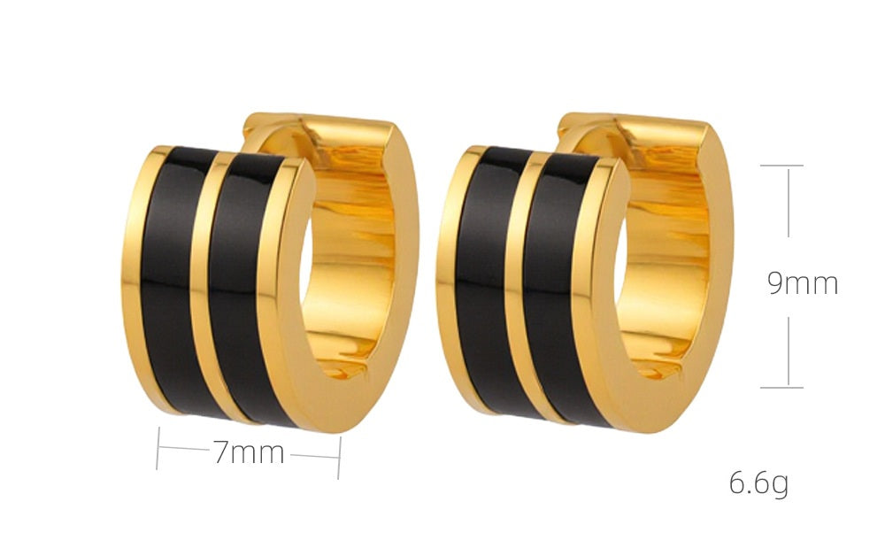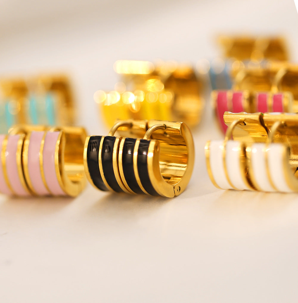 Confeccionado em Aço Inoxidável com um luxuoso banho de Ouro 18K, o brinco garante durabilidade excepcional, resistência à água e o brilho intenso do dourado. O destaque fica por conta do design clássico de argola huggie (abraço), com a parte frontal adornada com três faixas de esmalte colorido em alto-relevo (disponível em cores como preto, branco, rosa e mais). O contraste das cores com o dourado polido cria um visual marcante e divertido.