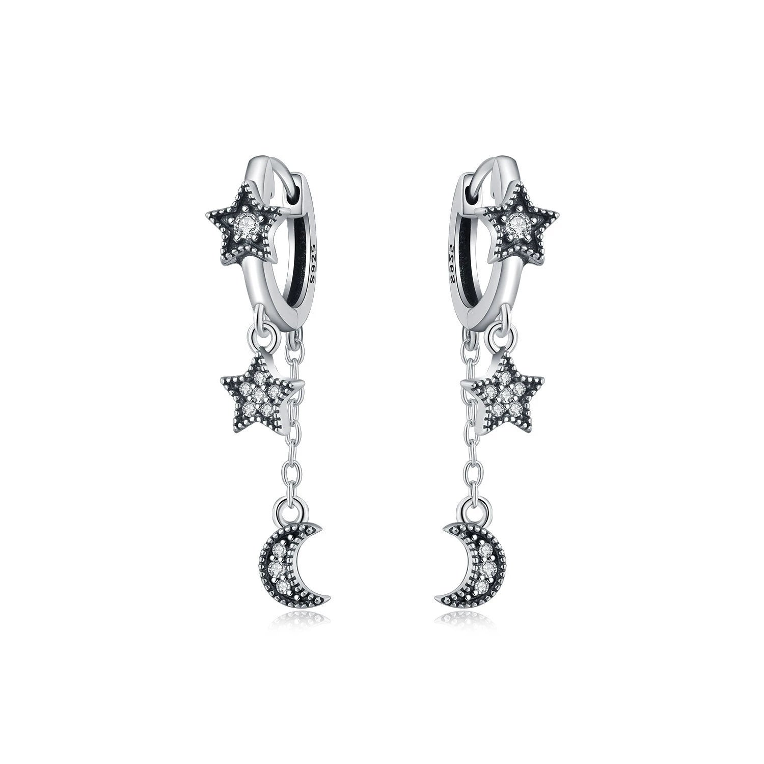 Confeccionado em Prata Esterlina 925, o brinco é durável, hipoalergênico e ideal para uso diário. A argola é complementada por uma corrente delicada com pingentes de estrelas e luas, todos cravejados com zircônias cintilantes. O brilho intenso das pedras adiciona um ponto de luz ao seu rosto, tornando a peça ainda mais especial.
