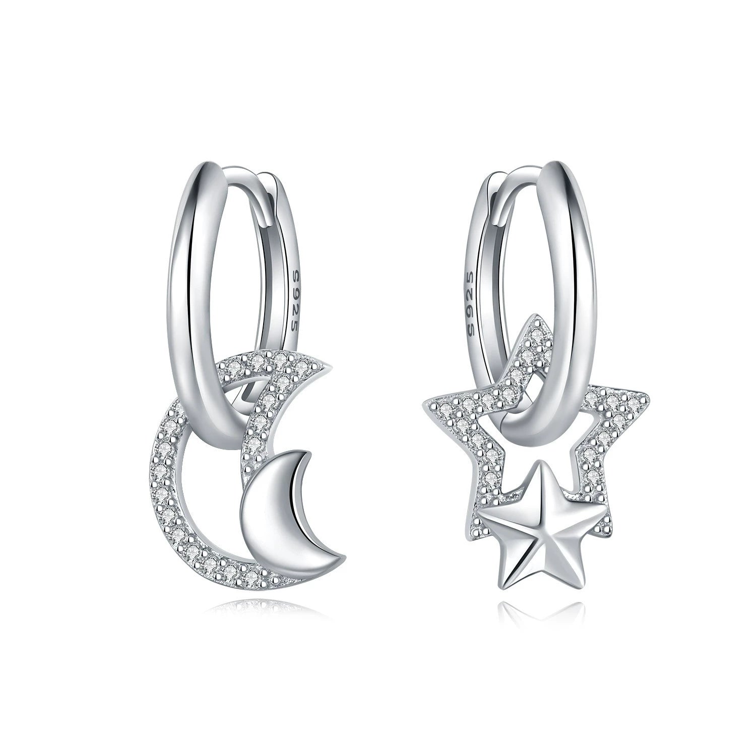 Confeccionado em Prata Esterlina 925, o brinco é durável, hipoalergênico e ideal para uso diário. As argolas são complementadas por um pingente de estrela e de lua, todos cravejados com zircônias cintilantes. O brilho intenso das pedras adiciona um ponto de luz ao seu rosto, tornando a peça ainda mais especial.
