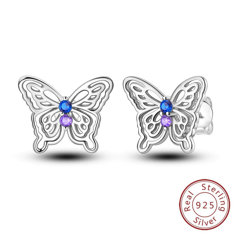 Confeccionado em Prata Esterlina 925, o brinco é durável e hipoalergênico, ideal para uso diário. O destaque fica por conta das zircônias azul e roxa que adornam o centro das asas, criando um contraste vibrante e um brilho que captura a luz. O desenho vazado nas asas da borboleta confere à peça um charme ainda mais único e detalhado.