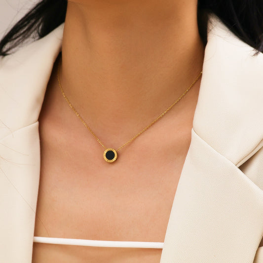 Confeccionado em Aço Inoxidável com um luxuoso banho de Ouro 18K, o colar garante durabilidade excepcional, resistência à água e o brilho intenso do dourado. O destaque fica por conta do pingente de círculo, com o centro preenchido pelo intenso ônix preto, que oferece um contraste elegante com o ouro. A borda do pingente é detalhada com pequenas gravuras, que adicionam uma textura sutil e sofisticada.
