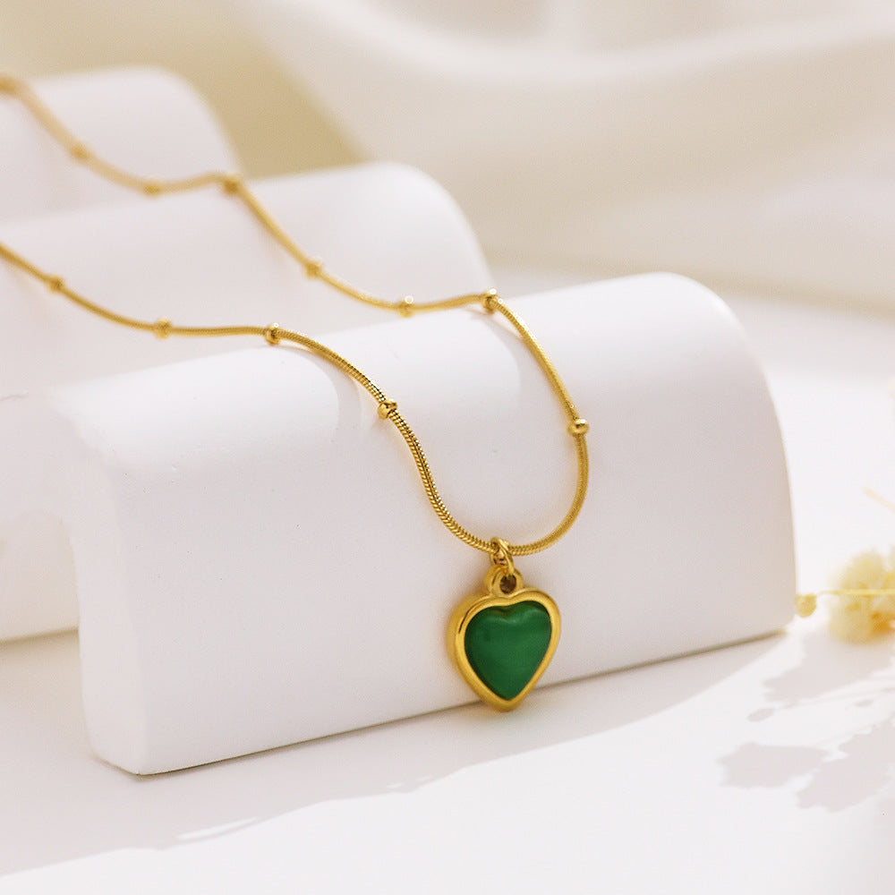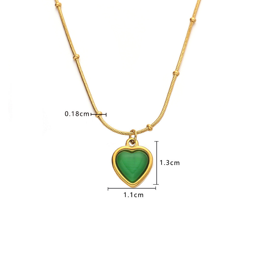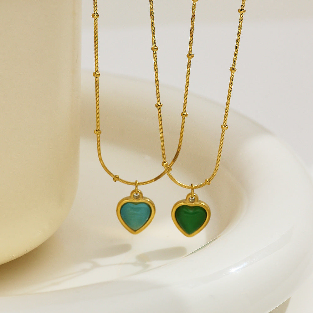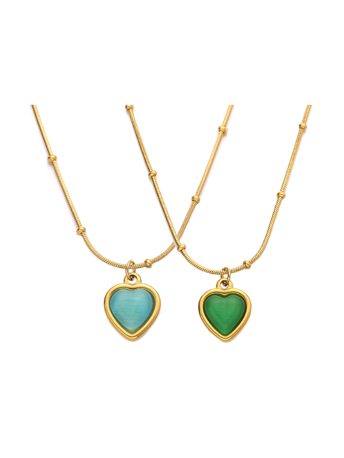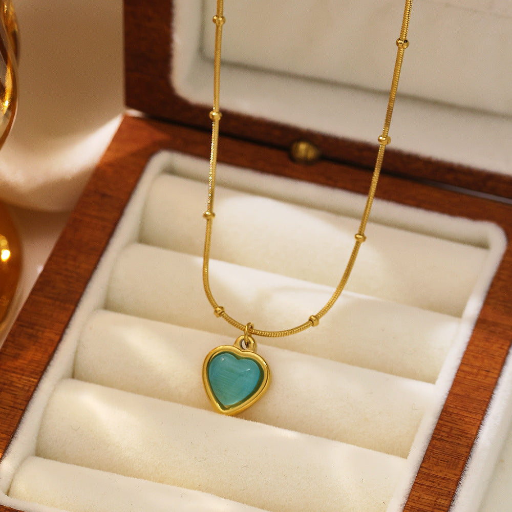 Confeccionado em Aço Inoxidável com um luxuoso banho de Ouro 18K, o colar garante durabilidade excepcional, resistência à água e o brilho intenso do dourado. O destaque fica por conta do pingente de coração com o centro preenchido por uma pedra colorida (disponível em azul e verde), que simula o efeito olho de gato (cabochão). A moldura polida e a corrente delicada com pequenas esferas adicionam um toque de charme e sofisticação.