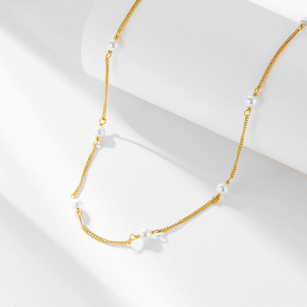 Confeccionado em Prata 925 com um elegante banho de ouro, o colar é hipoalergênico e garante brilho e durabilidade. O destaque fica por conta das pequenas pérolas que, com sua forma natural, são distribuídas ao longo da corrente. O design tipo "station" cria um efeito de pontos de luz no colo, adicionando um toque de leveza e charme.