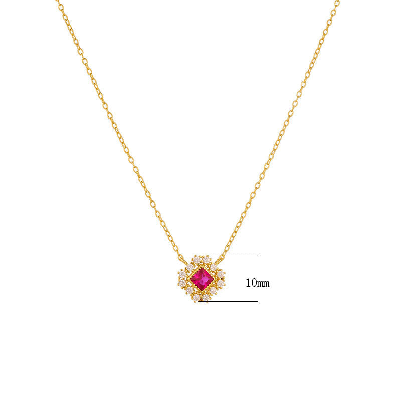 Confeccionado em Prata 925 com um elegante banho de ouro, o colar é hipoalergênico e garante brilho e durabilidade. O destaque fica por conta do pingente de rubi sintético, que é lapidado em formato quadrado, criando um visual moderno e vibrante. A moldura com zircônias cravejadas realça a cor intensa da pedra, adicionando um toque de luxo.