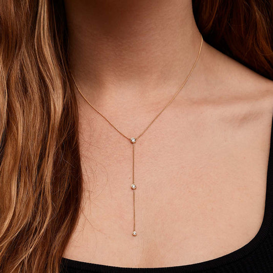 Confeccionado em Prata 925 com um elegante banho de ouro, o colar é hipoalergênico e garante brilho e durabilidade. O destaque fica por conta do seu formato estilo gravata (lariat), com três pedras de zircônia que caem em cascata, criando um caminho de luz deslumbrante. O design clean e moderno da peça a torna única.