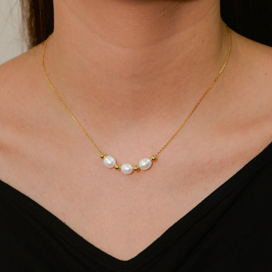 Confeccionado em Prata 925 com um elegante banho de ouro, o colar é hipoalergênico e garante brilho e durabilidade. O destaque fica por conta das três pérolas de água doce que, com suas formas orgânicas e únicas, adicionam um toque natural e autêntico. As pequenas esferas douradas entre as pérolas complementam a peça com sua delicadeza e charme.