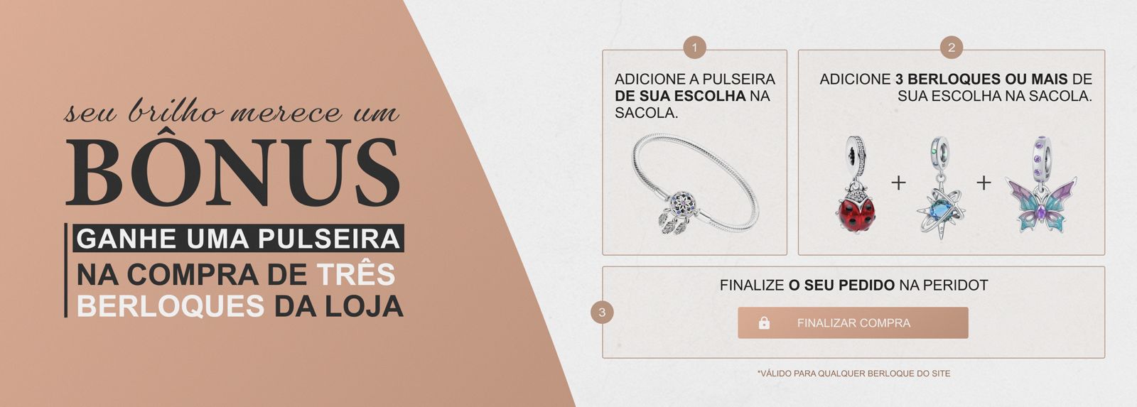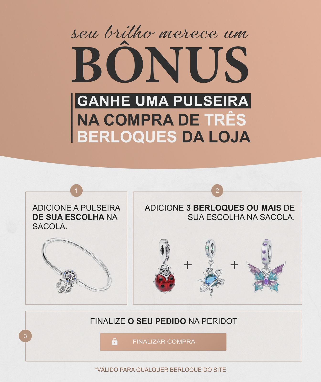 Este é o momento perfeito para você viver experiências inesquecíveis, aproveitando essa oferta imperdível, adquirindo o seu berloque para o sua coleção ou presenteando quem você ama com um mimo maravilhoso!Compatível com as Pulseiras para BerloquesMetal Prata de leiPORQUE COMPRAR CONOSCO?Rastreamento: Nosso sistema envia automaticamente e-mails em até 3 dias úteis após a confirmação do pedido.Compra Garantida: Receba o produto que está esperando ou devolvemos o dinheiro.Compra Segura: Criptografia SSL para 100% de proteção na hora da compra.Devolução Grátis: Você tem 7 dias a partir da data de recebimento.Prazo de Entrega: Em média de 12 a 20 dias úteis, após o envio do produto.Atendimento: Suporte ao cliente pré e pós compra humanizado.GARANTIAA Peridot quer que você use suas joias sem defeitos e por isso oferece a garantia de 6 meses a partir da data da compra:O que devo fazer se receber um item danificado?Na rara ocorrência de um item ter sido danificado durante o transporte, entre em contato com nosso centro de atendimento ao cliente e solicite sua troca.Todas as nossas peças são fabricadas na Tailândia. Para maiores informações entre em contato conosco através das nossas centrais de Atendimento.Promoção -