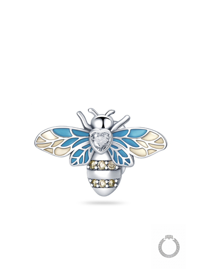 Confeccionado em Prata S925, o berloque garante durabilidade e brilho intenso. O destaque fica por conta do design da abelha, que simboliza a comunidade, o esforço e a prosperidade. As asas são artisticamente preenchidas com esmalte azul e creme, enquanto o corpo é cravejado com zircônias amarelas/champagne. O toque final é a zircônia em formato de coração que adorna a cabeça da abelha, representando a paixão e o amor.