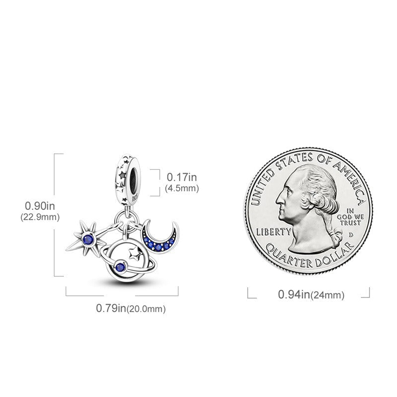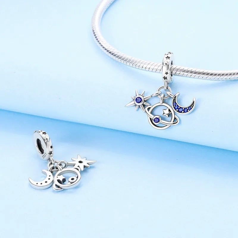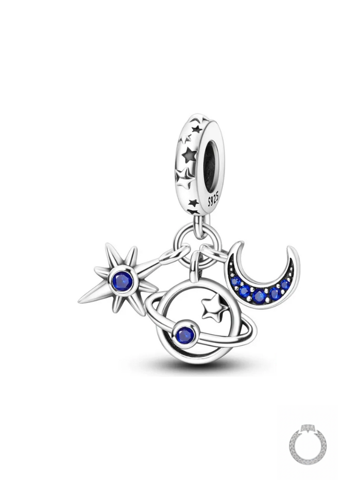 Feito em Prata 925 autêntica, este berloque pendente é um convite para o mundo da astrologia e dos sonhos. Ele traz um conjunto de pingentes celestiais: uma estrela com sua cauda, uma lua crescente e um planeta com seu anel. Todos são cravejados com gemas azuis que brilham como as estrelas no céu.