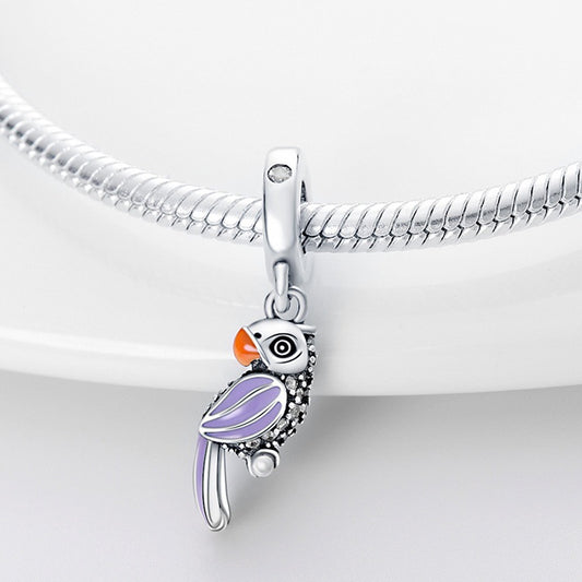 Confeccionado em Prata S925, o berloque garante durabilidade e brilho. O destaque fica por conta do design do papagaio pendente, com o corpo ricamente cravejado com zircônias cintilantes e a asa adornada com esmalte roxo/lilás para um toque de cor vibrante. O passante é finalizado com uma zircônia extra, adicionando mais luz à peça.
