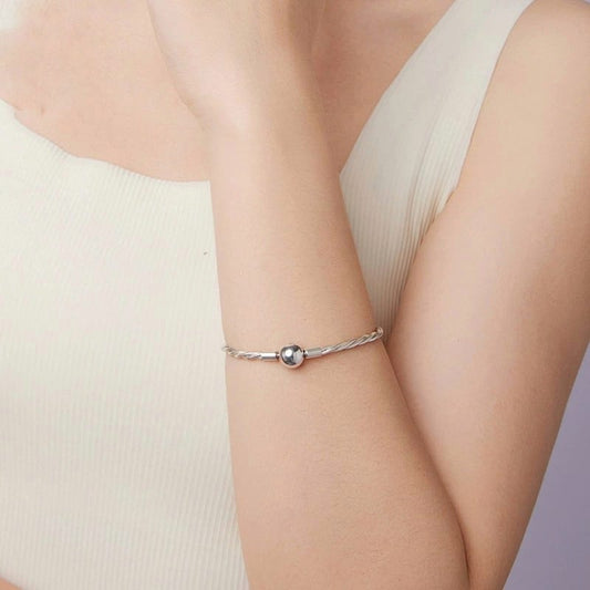 "Adicione um toque de elegância moderna e simplicidade ao seu pulso com a nossa Pulseira Semi-Rígida para berloques Nó de Prata.Feita em Prata 925 legítima, esta peça se destaca pelo seu design inovador. O fio é delicadamente torcido, criando um efeito visual que lembra uma corda macia e maleável. O destaque é o fecho esférico, um detalhe minimalista e sofisticado que completa o look com perfeição.