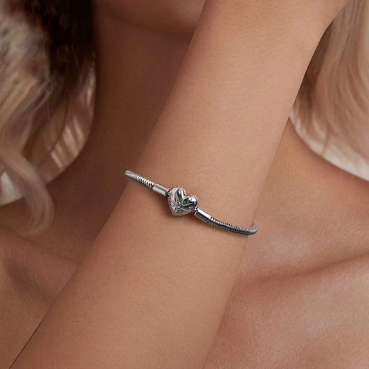 "Comece a sua história com a nossa Pulseira Coração de Luz.Feita em Prata 925 autêntica, esta pulseira tem um design clássico e elegante, com uma malha lisa e maleável que se ajusta perfeitamente ao pulso. Seu fecho, em forma de coração, é o grande destaque: ele se abre e fecha com segurança para receber e proteger seus berloques favoritos. Com uma estrela delicada no centro, ele brilha como um lembrete de que sua coleção de memórias começa aqui.