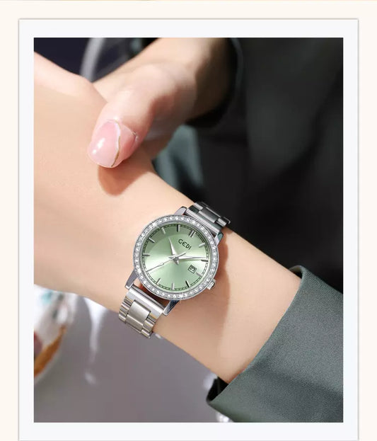 disponível em diversas cores de mostrador e acabamentos metálicos (prateado e rosé gold). O destaque fica por conta da moldura cravejada de zircônias, que adiciona um toque de luxo sutil e glamour à peça. Além de tudo, ele é um relógio de quartzo, garantindo precisão e funcionalidade.
