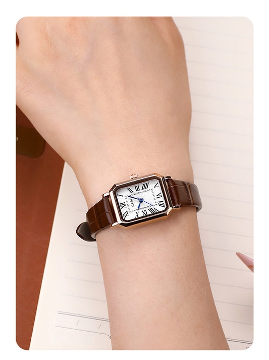Seu design minimalista com caixa quadrada e mostrador com numerais romanos evoca um estilo retrô e elegante. Pequeno e discreto, este relógio de quartzo é o acessório ideal para qualquer ocasião, do casual ao formal. A variedade de cores da pulseira em couro permite que você personalize seu look e adicione um toque de "temperamento" à sua rotina. Além de tudo, ele é à prova d'água, combinando beleza e praticidade.