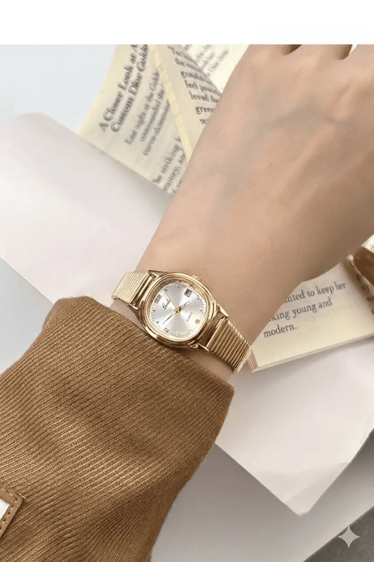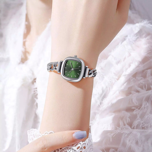 Seu design minimalista com caixa quadrada e mostrador em cores elegantes evoca um estilo retrô e discreto. Pequeno e delicado, este relógio de quartzo é o acessório ideal para qualquer ocasião, do casual ao formal. A pulseira em aço com elos largos oferece um toque de estilo e durabilidade. Além de tudo, ele é à prova d'água, combinando beleza e praticidade.