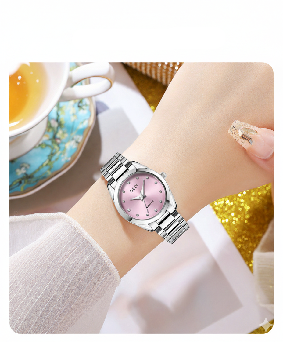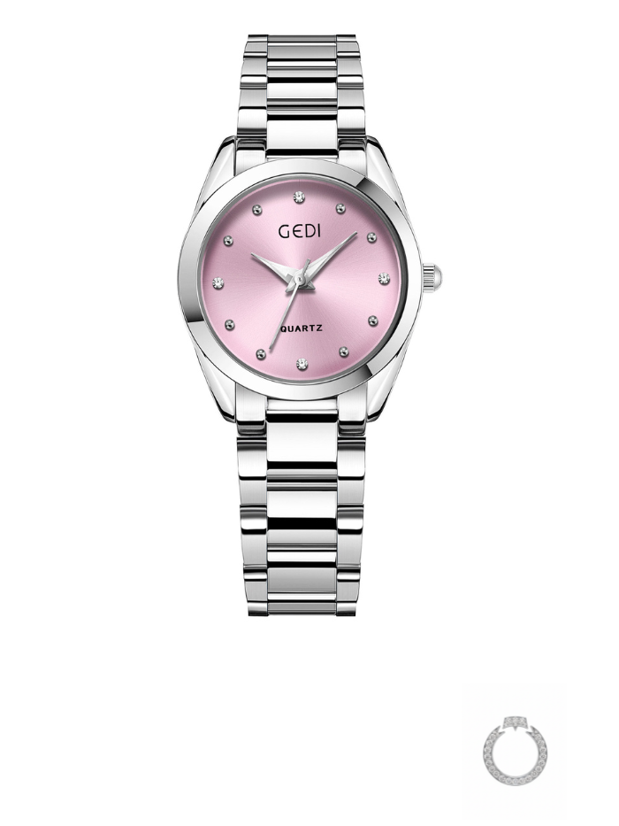 Seu design minimalista com caixa redonda e mostrador em cores vibrantes evoca um estilo retrô e elegante. Pequeno e delicado, este relógio de quartzo é o acessório ideal para qualquer ocasião, do casual ao formal. A pulseira em aço com detalhes de brilho oferece um toque de estilo e durabilidade. Além de tudo, ele é à prova d'água, combinando beleza e praticidade.