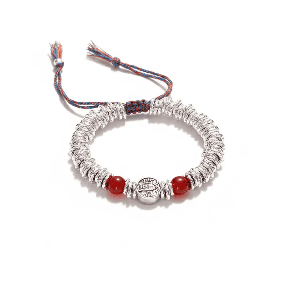 Seu design inovador em espiral de anéis de metal se adapta perfeitamente ao pulso. Os pingentes são ricos em detalhes, com destaque para o charm central com símbolo de sorte e as duas pedras vermelhas, que representam energia, vitalidade e proteção. A corda ajustável em tons vibrantes adiciona um toque alegre e dinâmico.
