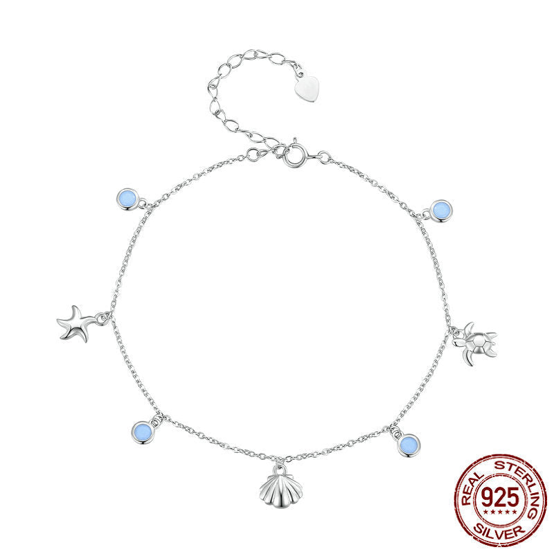 Feita com prata 925 legítima, esta tornozeleira é adornada com pequenas conchas e estrelas-do-mar, complementadas por pingentes com um toque sutil de azul, que lembram a transparência e o brilho da água.