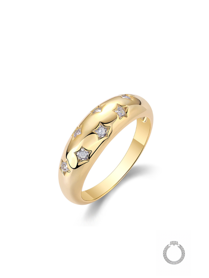 O design se destaca pela sua forma abaulada e lisa (dome ring), que proporciona um visual robusto e confortável. Ao longo da superfície polida, pequenas zircônias cúbicas são incrustadas em lapidação especial que simula o formato de estrelas, criando uma verdadeira constelação cintilante no seu dedo.
