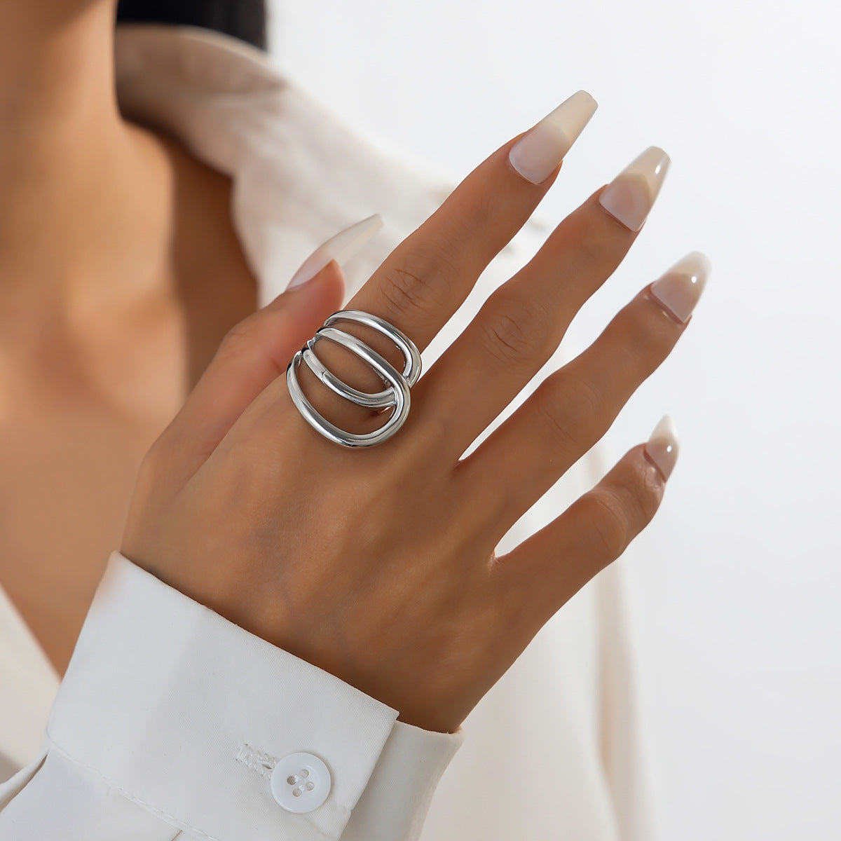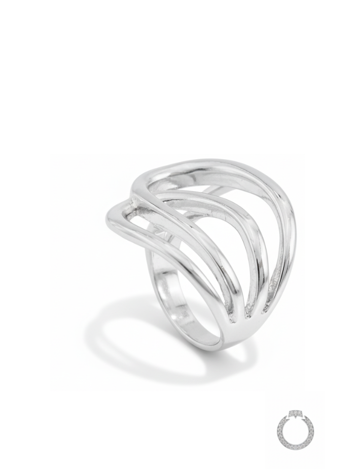 O design se destaca pela sua estrutura larga e vazada, composta por três faixas onduladas que se entrelaçam suavemente. A modelagem cria um efeito de movimento e uma estética contemporânea, que se adapta confortavelmente ao dedo.
