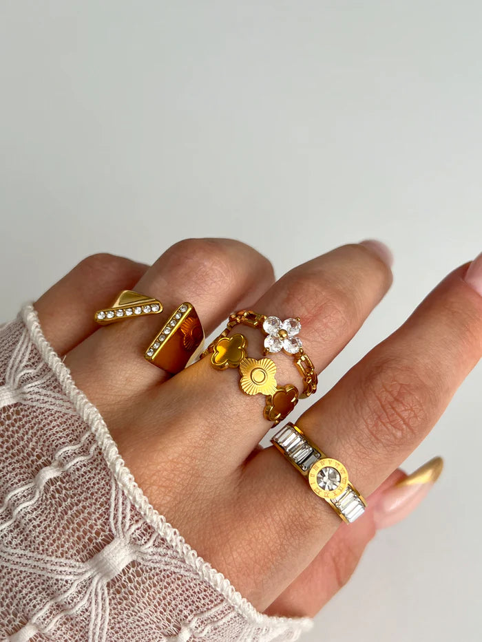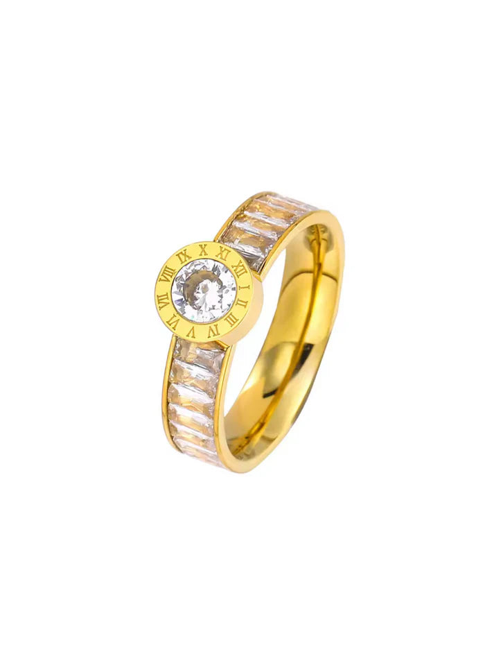 Confeccionado em Aço Inoxidável com um luxuoso banho de Ouro 18K, o anel garante durabilidade excepcional, resistência à água e o brilho intenso do dourado. O destaque fica por conta do seu design moderno e elegante: a peça possui um aro com laterais cravejadas por zircônias em corte baguete, e um motivo central redondo adornado com numerais romanos e uma grande zircônia solitária.