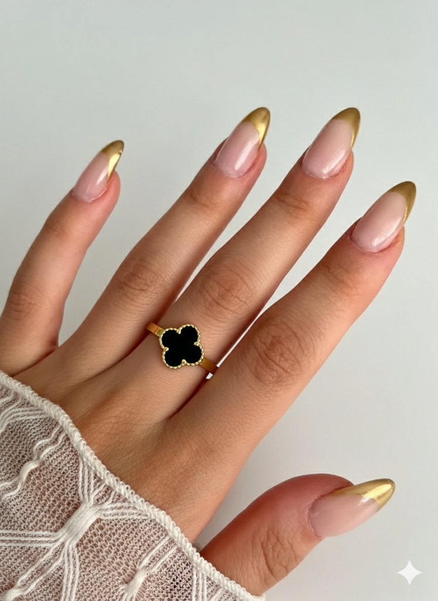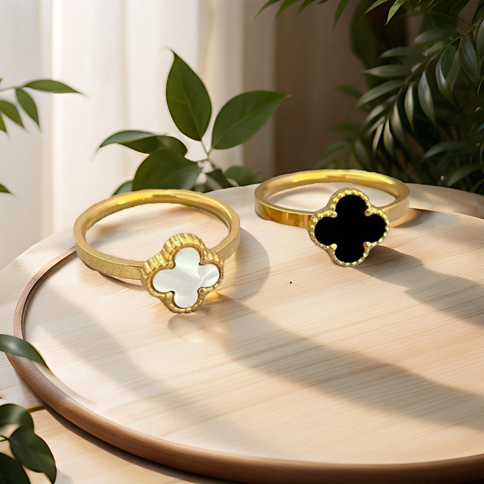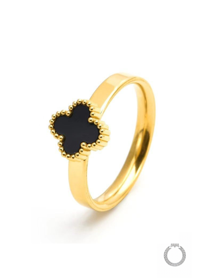 Confeccionado em Aço Inoxidável com opções de acabamento em luxuoso banho de Ouro 18K ou elegante prata polida, o anel garante durabilidade excepcional, resistência à água e um brilho intenso. O destaque fica por conta do seu design minimalista e fino, com o topo em formato de trevo de quatro folhas preenchido com ônix preto. O contraste marcante entre o preto e o dourado/prateado confere à peça um visual chique, discreto e atemporal.