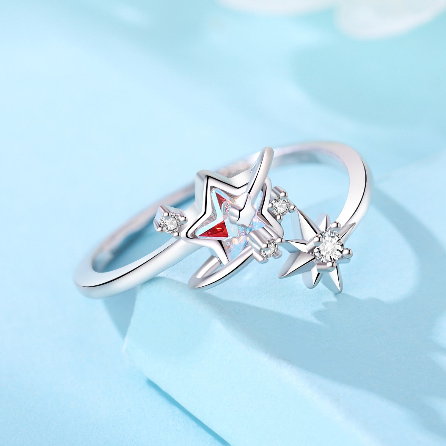 • Detalhes: Anel ajustável com design de duas estrelas, uma com cristal furta-cor e a outra com zircônia solitária.
