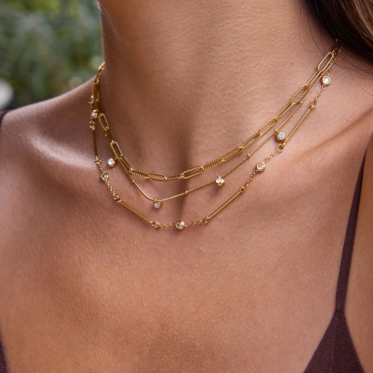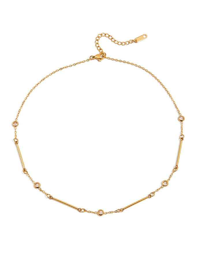 Confeccionado em Aço Inoxidável com um luxuoso banho de Ouro 18K, o colar garante durabilidade excepcional, resistência à água e o brilho intenso do dourado. O destaque fica por conta do seu design station (pontos de luz) que intercala delicados bastões polidos e pequenos pontos de zircônia em bezel (emoldurados). A repetição do padrão cria um ritmo visual clean e elegante no seu colo.