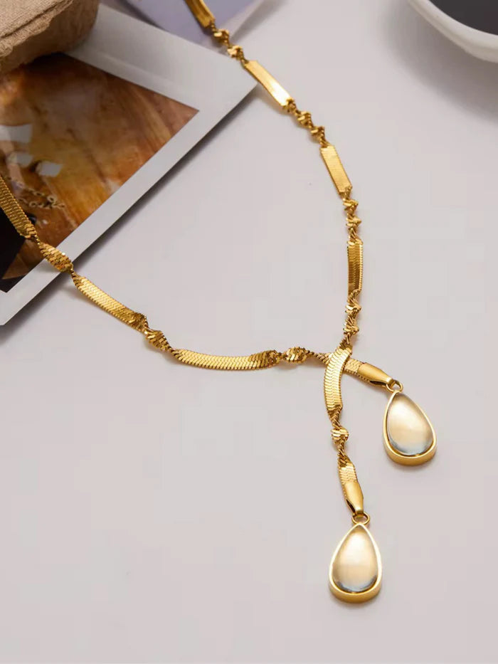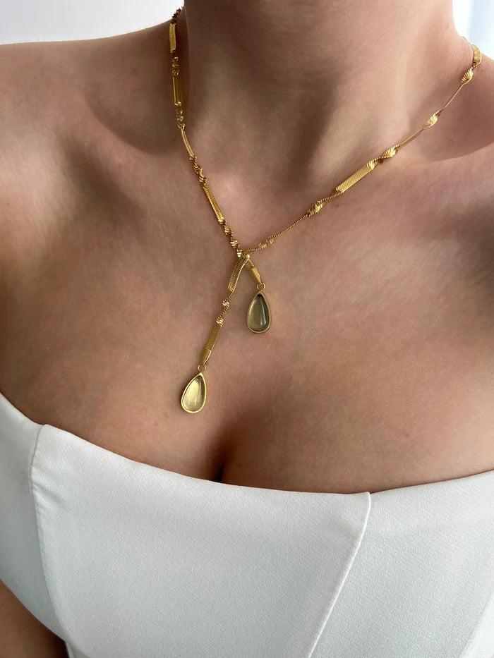 Confeccionado em Aço Inoxidável com um luxuoso banho de Ouro 18K, o colar garante durabilidade excepcional, resistência à água e o brilho intenso do dourado. O destaque fica por conta do seu design em corrente malha snake (espinha de peixe) que se torce suavemente no centro, formando uma "gravata" ou lariat. Duas gotas de pedra natural com acabamento leitoso pendem elegantemente, adicionando um toque orgânico e sofisticado.