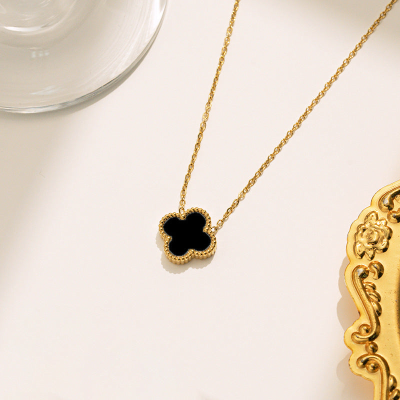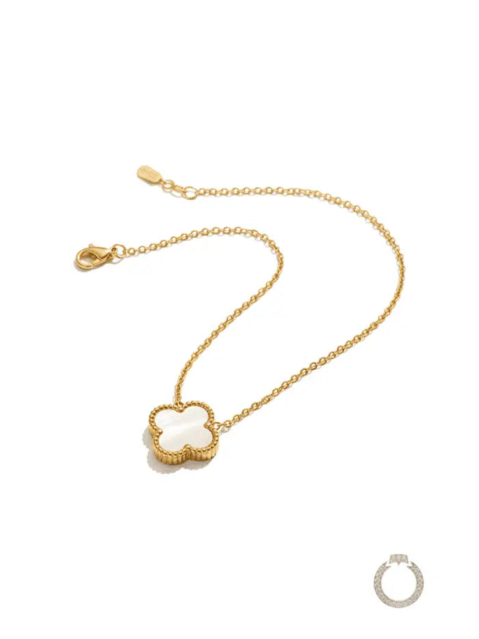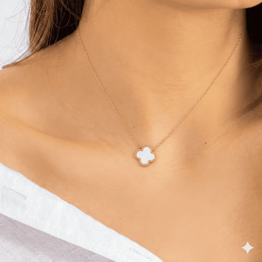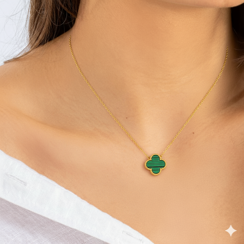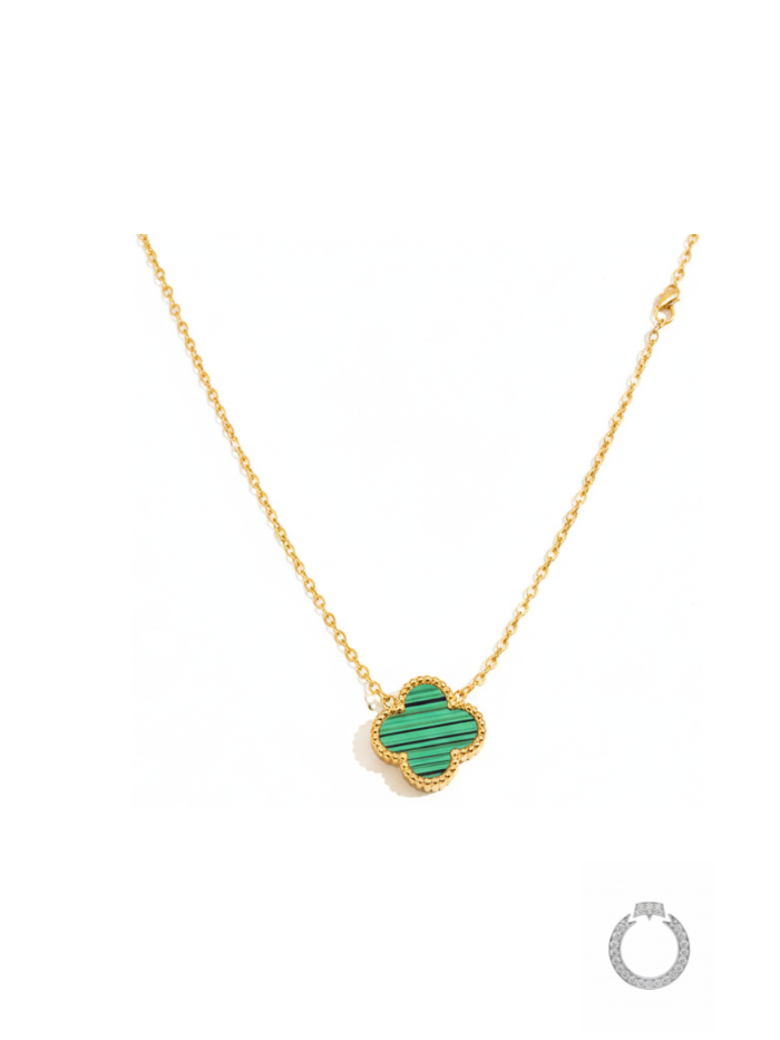 Confeccionado em Aço Inoxidável com um luxuoso banho de Ouro 18K, o colar garante durabilidade excepcional, resistência à água e o brilho intenso do dourado. O destaque fica por conta do pingente em formato de trevo de quatro folhas, um poderoso amuleto de sorte. O centro do trevo é preenchido com: